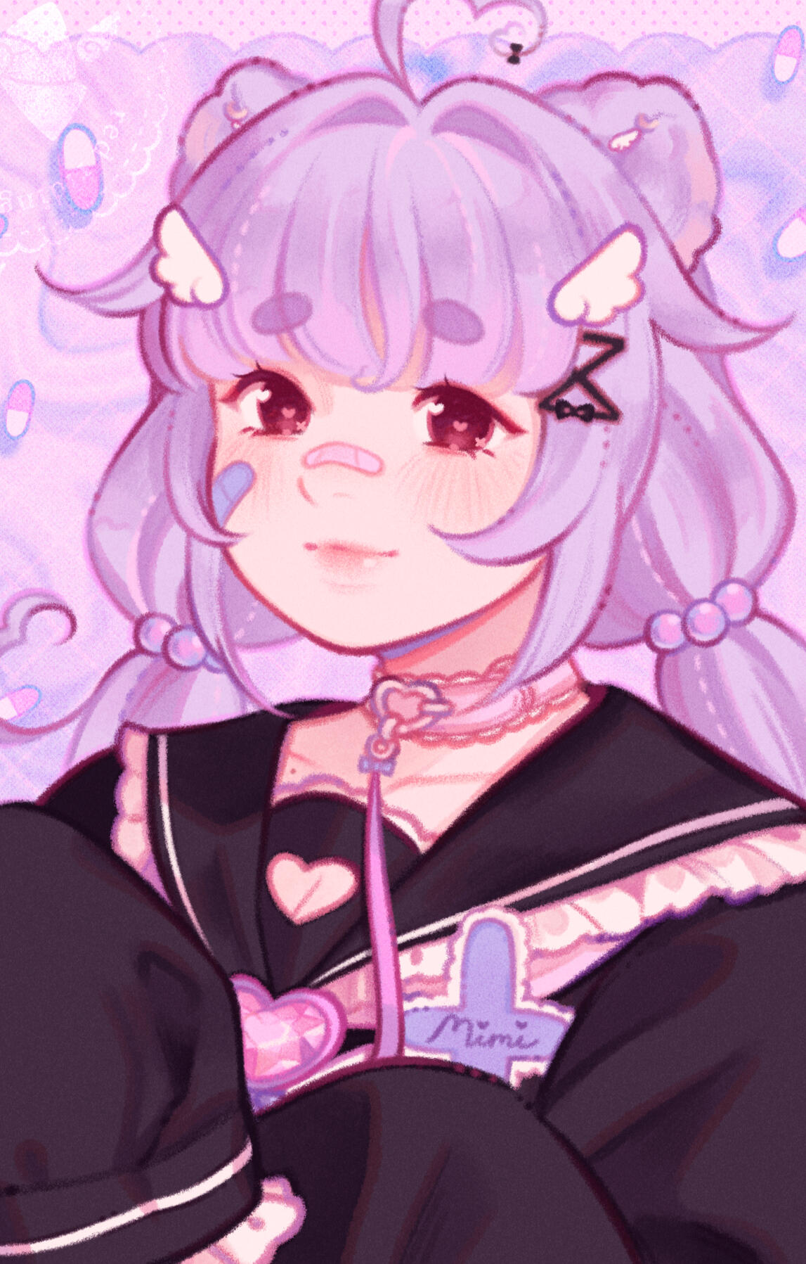 mimi was an average girl struggling from various forms of illness. the continuous pain, trauma, and stress drove her to her breaking point.her soul was trapped in purgatory, until being pulled out by the god of love, giving her a second chance at life as a fallen angel.forming a contract with her familiar, bibi, she became a magical girl! fighting evil while being cute! mimi was incredibly violent, slashing up her enemies with her lovely bibi-chan box cutter! despite her violence prone ways, mimi was beloved by all, and the public was shocked when she retired to become a full-time neet streamer!though she finds it cheesy, with the power of love, she was granted a pure halo of light, transforming her into a full angel.mimi currently resides in a seaside ghost town, in a tiny cottage near the mountain range.